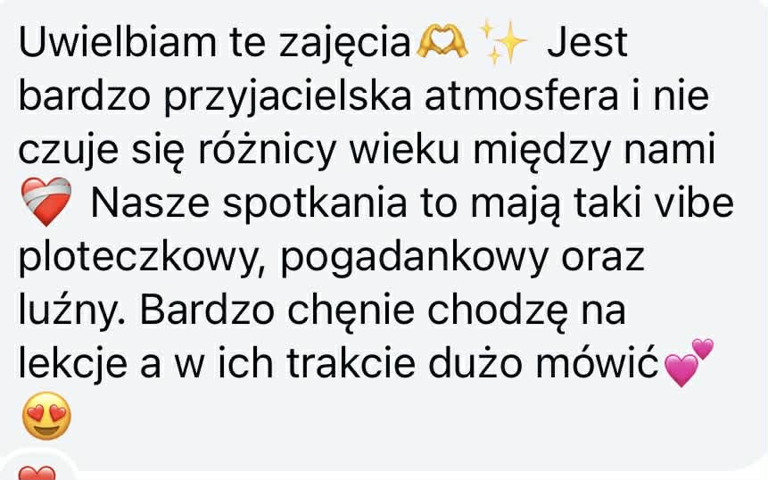 Zajęcia odbywają się w kameralnych grupach 2-4 osób tak, żeby każda z Was miała przestrzeń do mówienia.