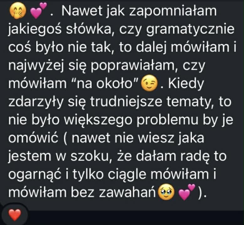 Tak - ANGflow jest dokładnie dla osób takich, jak Ty. Problemem nie jest to, że nie masz wiedzy. Po prostu nie miałaś jeszcze okazji uczyć się mówienia w miejscu, w którym możesz tworzyć nieidealne zdania i nikt nie będzie Cię wytykać palcami. W zamian za to - pogratulujemy Ci pierwszej rozmowy i z zaciekawieniem posłuchamy, co będziesz mówić dalej.