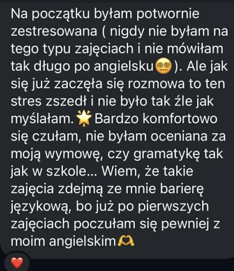 W ANGflow tworzymy przestrzeń, w której mówisz bez oceniania i bez presji. Podczas lekcji próbnej mówienie przychodzi naturalnie - poprowadzę Cię od samego początku i zobaczysz jak szybko odpuścisz stres.